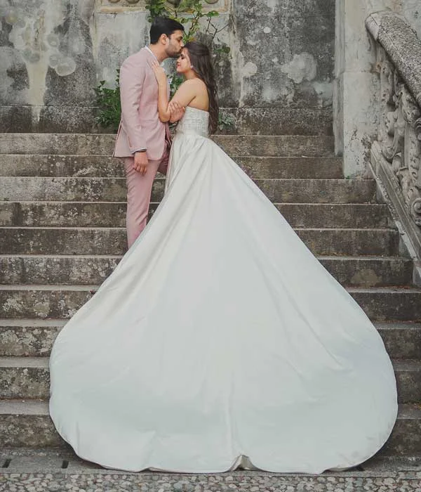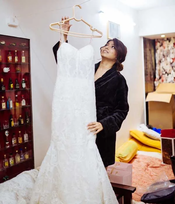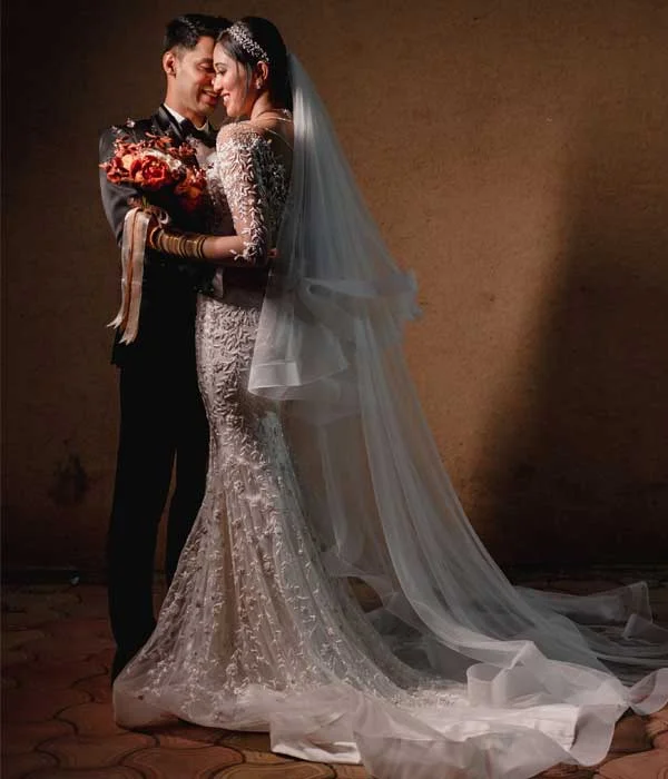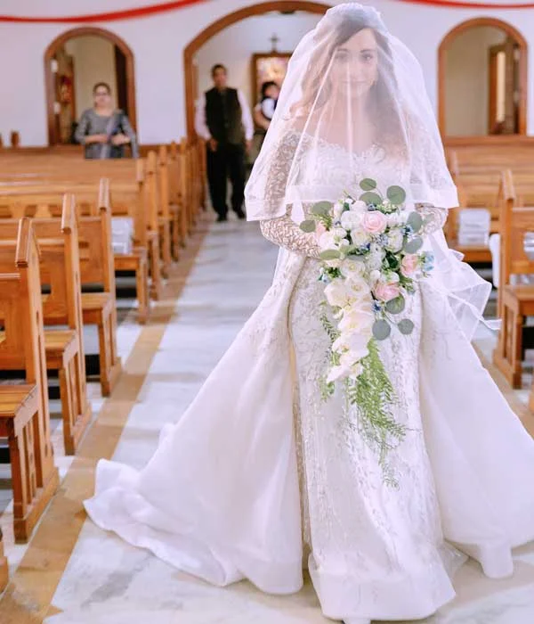 This enchanting gown blends the delicate elegance of Dutch satin with a beautifully embroidered bodice, achieving a perfect harmony of luxury and sophistication. The intricate embroidery adds a romantic touch, while the smooth silk fabric enhances the gown’s graceful flow. A stylish belt cinches the waist, highlighting your silhouette. The mermaid-style design contours the body flawlessly, creating a timeless and glamorous effect. For brides seeking a dramatic entrance, the detachable overskirt adds volume and flair, ensuring a bold and unforgettable statement on your special day.