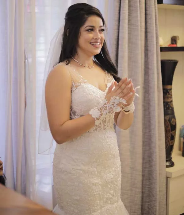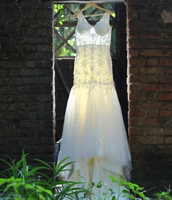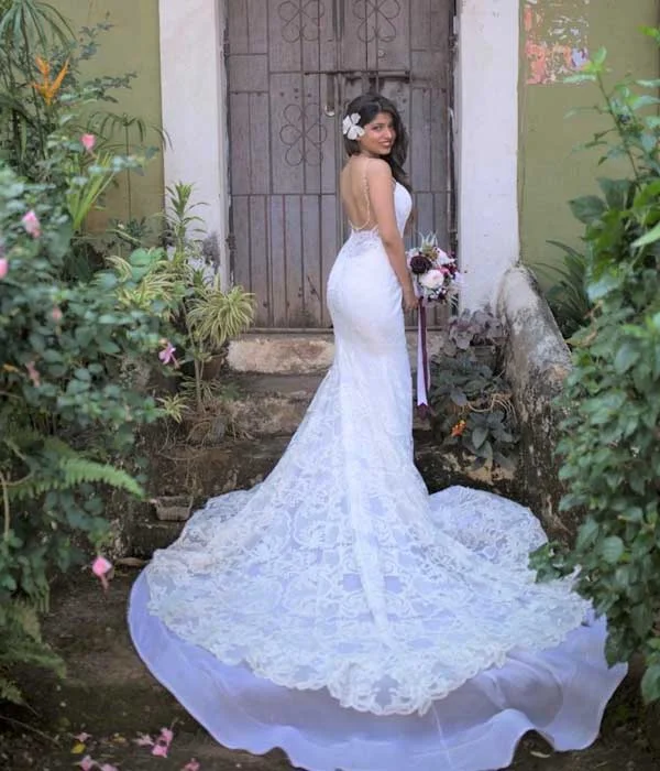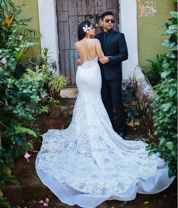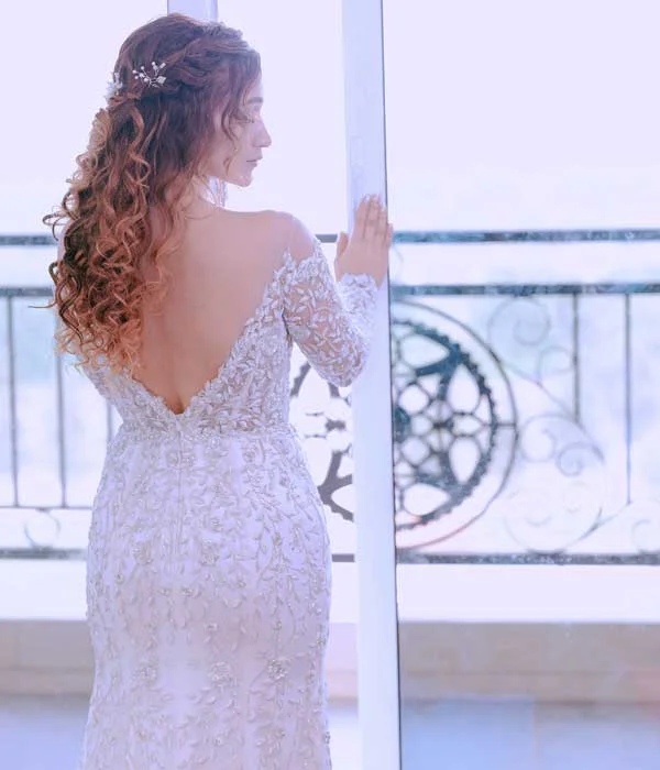 This stunning mermaid gown is designed to embrace your figure gracefully, highlighting your natural curves with elegance and sophistication. Timeless lace detailing adds a classic charm, seamlessly blending tradition with contemporary style. The wide open back creates a captivating focal point, while a delicate line of shimmering stones along the back adds just the right touch of glamour. This gown achieves the perfect harmony of boldness and romance, ideal for brides seeking a timeless design with a modern twist. Every element is meticulously crafted to ensure you radiate elegance on your special day.