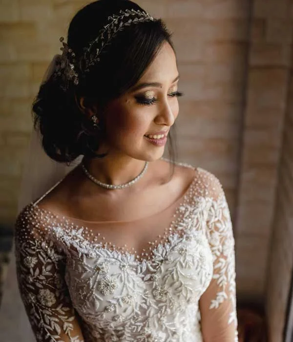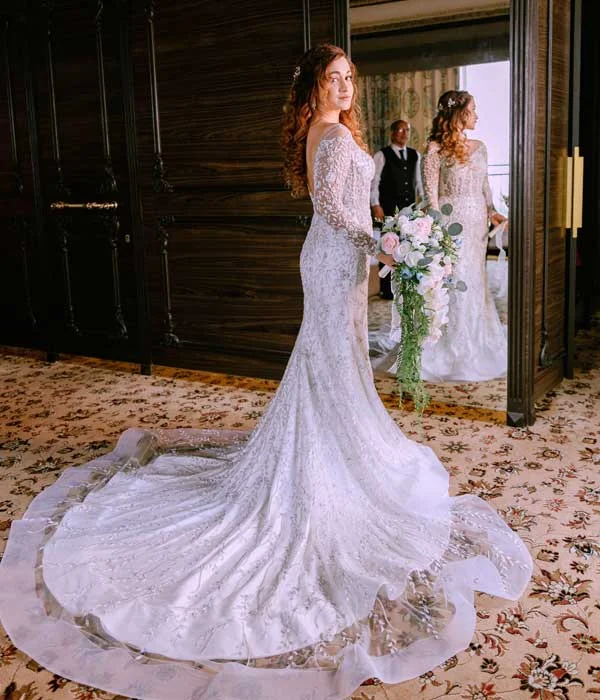 This breathtaking gown features a sheer corset bodice that radiates subtle sensuality while highlighting intricate hand embroidery, transforming it into a true work of art. Delicately adorned with sparkling stones, the bodice catches the light with every movement, adding a touch of glamour and sophistication. The long sleeves, equally detailed, provide timeless elegance that balances the boldness of the bodice. Flowing into a voluminous full skirt, this gown creates a regal silhouette, perfect for the modern bride who dreams of a fairytale moment. Every element is meticulously crafted to ensure you feel like royalty on your special day.
