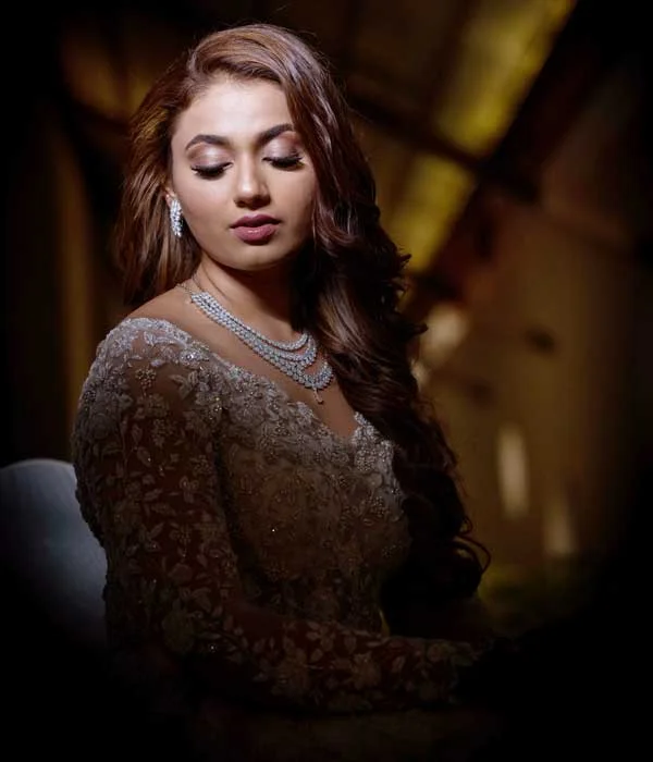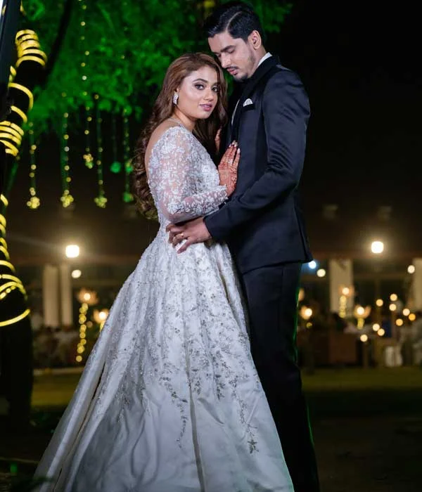 Step into the spotlight and captivate everyone in this stunning mermaid gown. The sheer corseted bodice creates a dramatic and alluring effect, while the floral hand embroidery extends gracefully along the length of the gown, achieving a look that is both romantic and elegant. The intricate floral design is accented with diamonds and sequins, adding a touch of glamour, while the exquisite silver threadwork catches the light with every step. Set over delicate tulle, the gown exudes an ethereal and refined charm. The mermaid silhouette enhances your figure beautifully, and the detachable overskirt adds an extra layer of drama. This remarkable gown allows your inner beauty to shine effortlessly.
