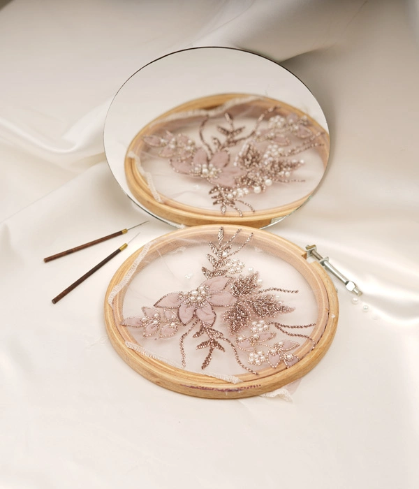 The embroidery process begins with a creative journey, where multiple design options are sketched to capture your unique vision, perfectly resonating with your style and setting the tone for your dream gown. This detailed drawing, known as the khaka, serves as a blueprint, providing a clear preview of the masterpiece that will come to life on your wedding day. Once finalized, the khaka is carefully pinned to the fabric, marking the beginning of the intricate handcrafting process. The design is meticulously transferred onto the fabric, ensuring precision and alignment. Skilled artisans then bring each element to life with detailed handwork—every bead, thread, and stitch placed with care—transforming the fabric into a true work of art that will dazzle and make your gown unforgettable.