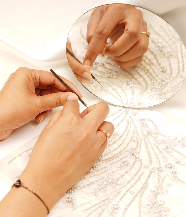 Our team of skilled artisans devotes countless hours to perfecting every detail of your gown. With a focus on hand-embroidered designs, every stitch, sequin, and bead is thoughtfully placed to reflect your individual style. From delicate beadwork to intricate sequins, our gowns uphold the highest standards of couture and refined elegance.